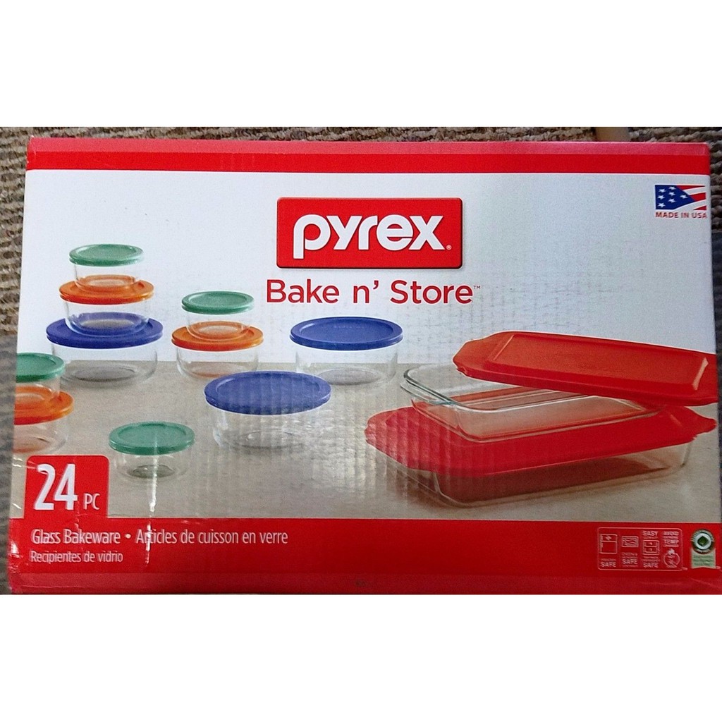 Pyrex 24pc Glass Bake N Store Set Description and Feature of Pyrex 24pc Glass Bake N Store Set Pyrex 24 piece bakeware and storage containers are great for baking and for all of your food storage. Only 2 left in stock - order soon.